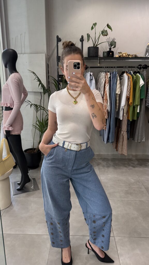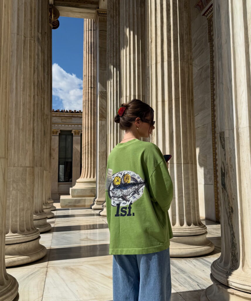 This is where Yuna really sings. Start with the “Finos film” Loose fit T-shirt from Less Sonder Feeling (79€) — an oversized tee printed with a nod to golden-era Greek cinema. A conversation starter that doesn’t require you to start the conversation.