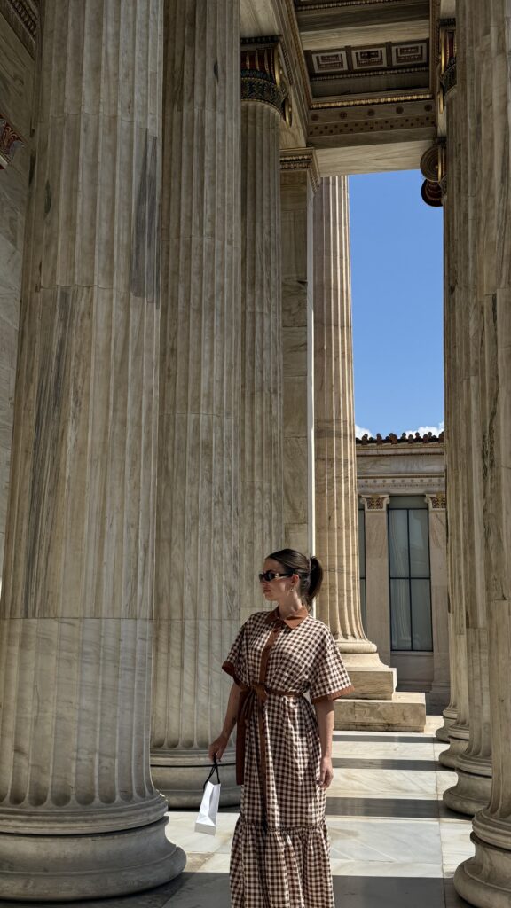 The math: one dress priced like a top, three accessories from three different Greek makers, one outfit that looks like you own a stylist.