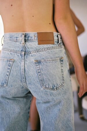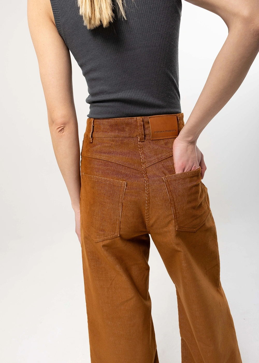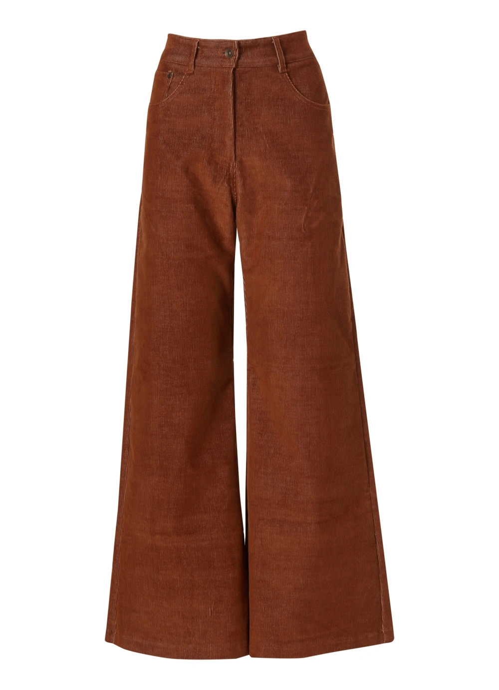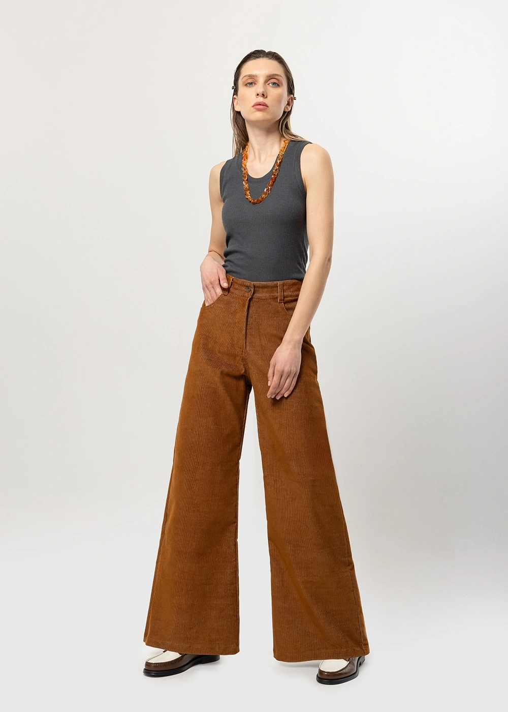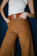 Corduroy trousers that sit high on the waist and have wide legs.