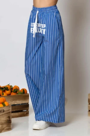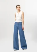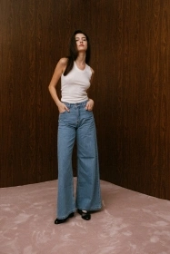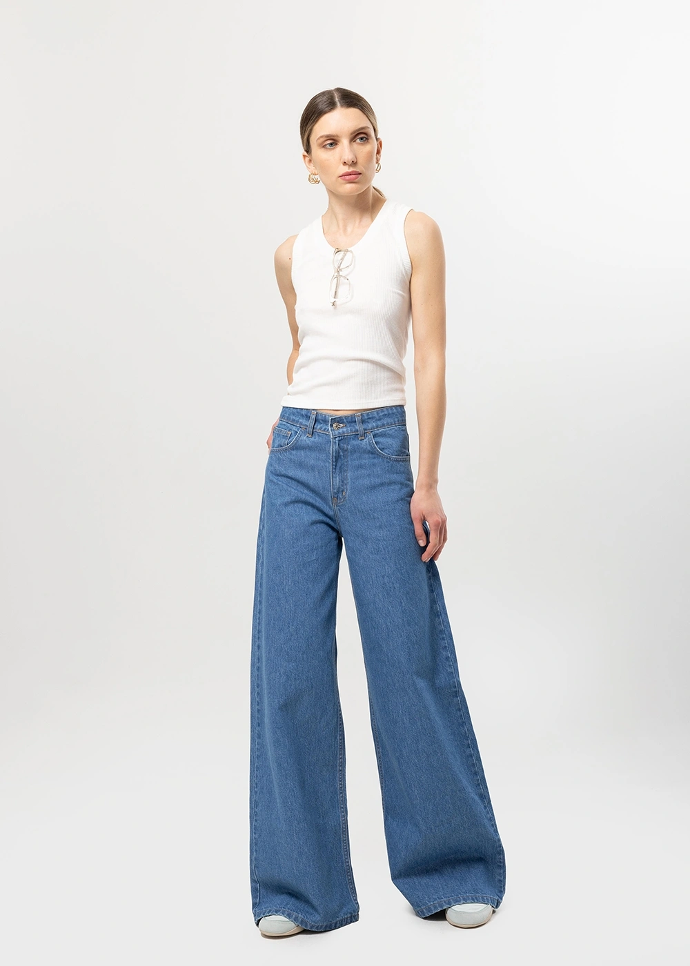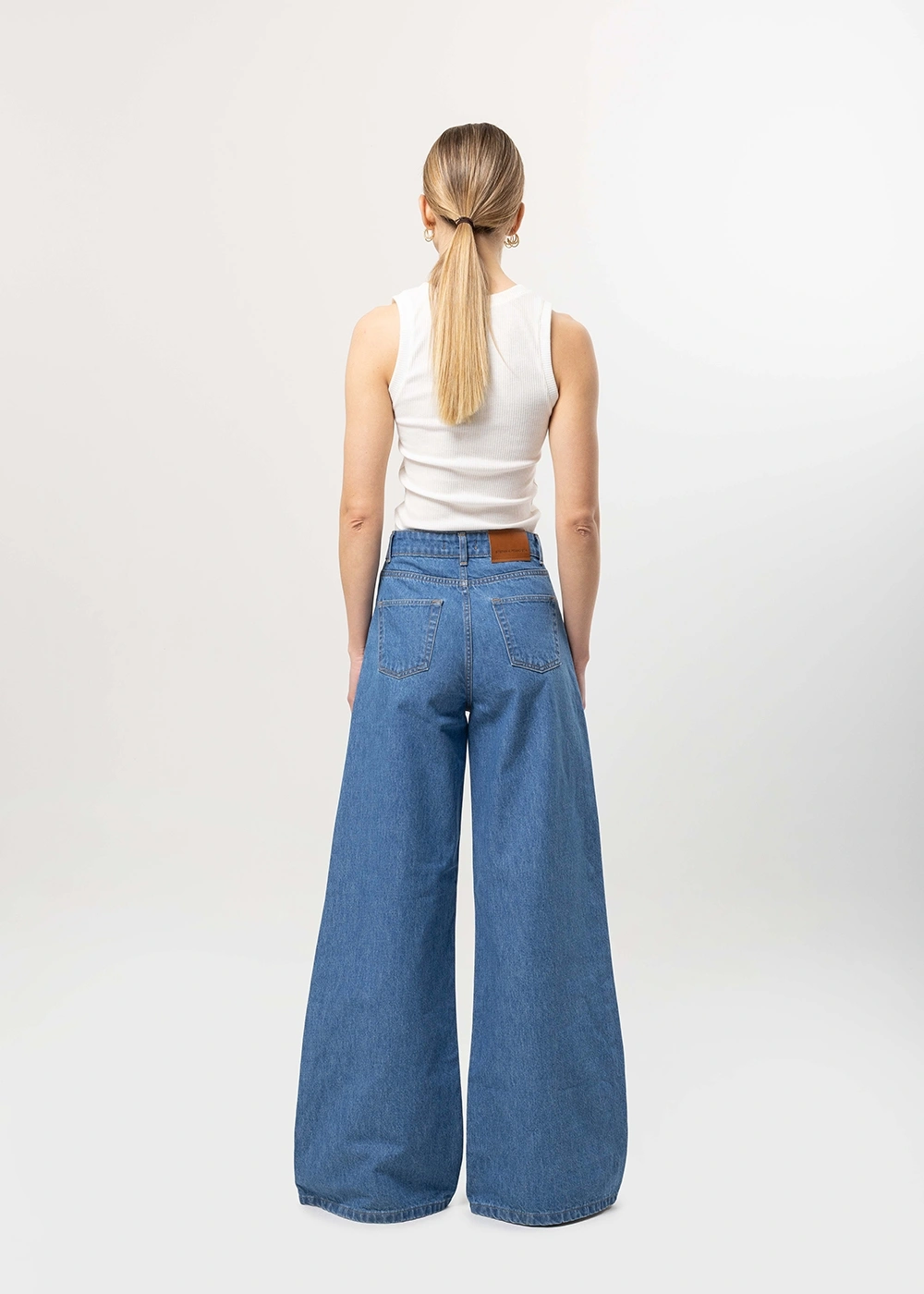 Denim trousers that are cut to sit high on the waist and have an exaggerated wide-leg shape.