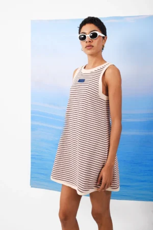 The Salt Skin Dress is a lightweight sleeveless mini with a relaxed A-line silhouette. Crafted from soft, breathable fabric, it features fine horizontal stripes, contrast trims and a clean round neckline. Easy to wear and effortlessly flattering, it offers comfort and movement, perfect for warm days, seaside escapes, or casual city styling.
