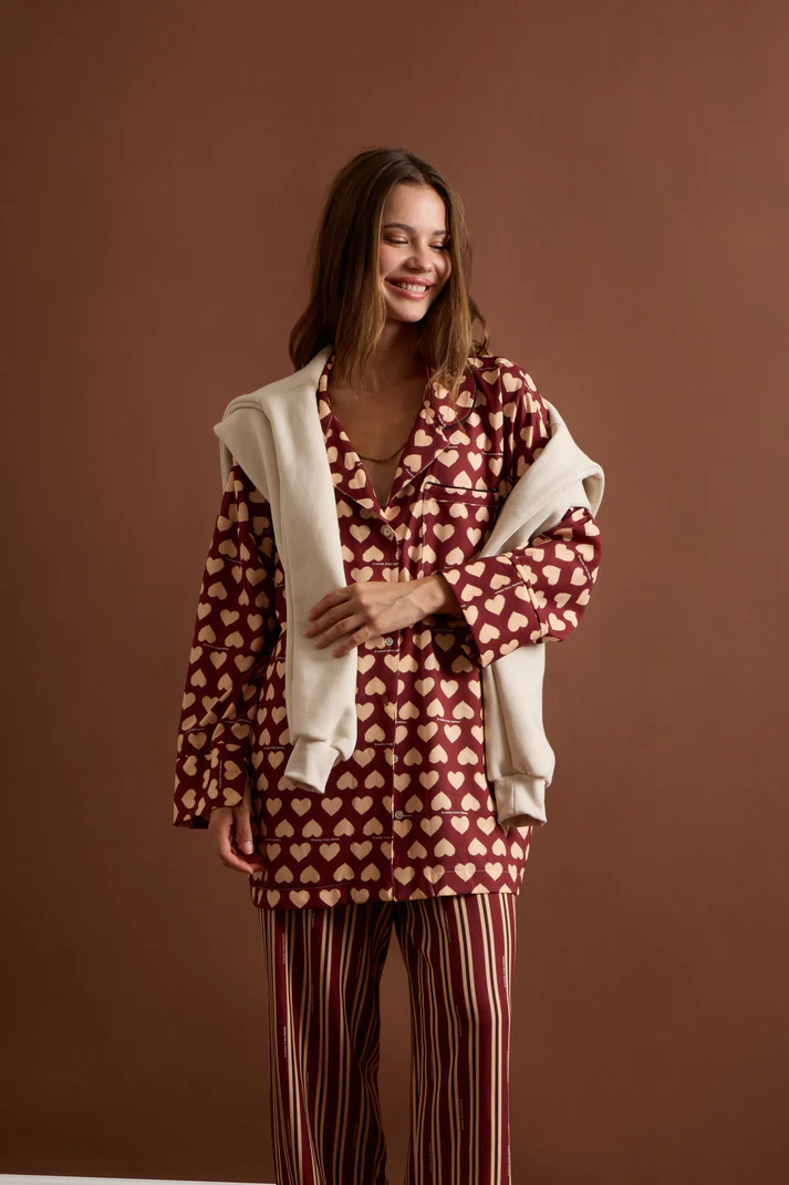 • All-over heart print in deep burgundy tones