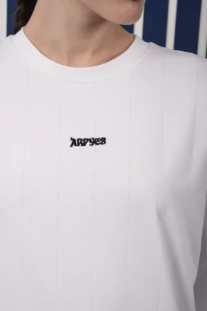 Relaxed short-sleeve T-shirt with a classic crew neckline and an easy, oversized fit. Made from soft fabric featuring subtle vertical stripe texture that adds depth to the clean design. Finished with a small embroidered ARPYES logo at the chest, making it a versatile everyday piece for effortless styling.
