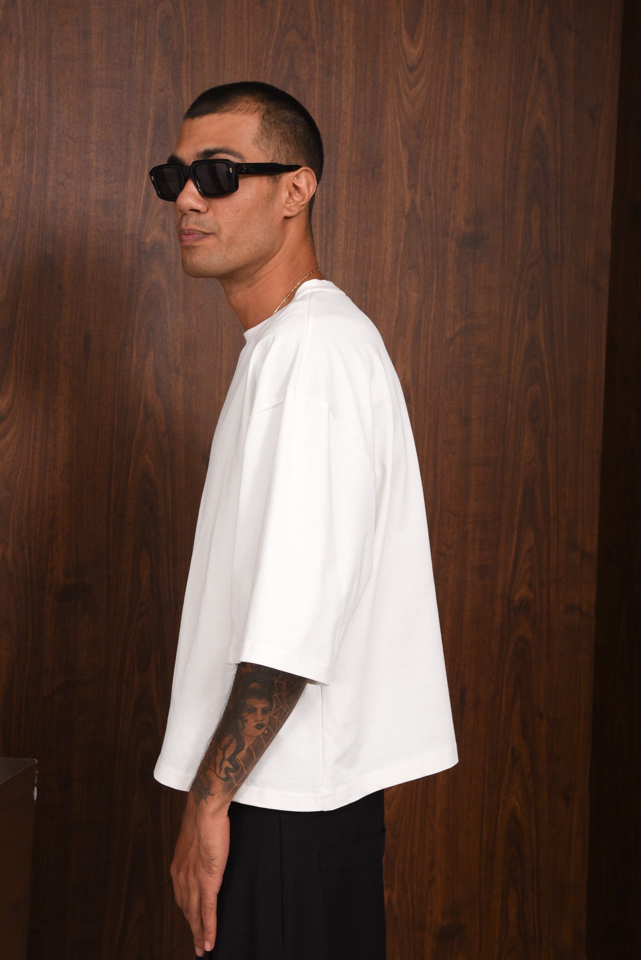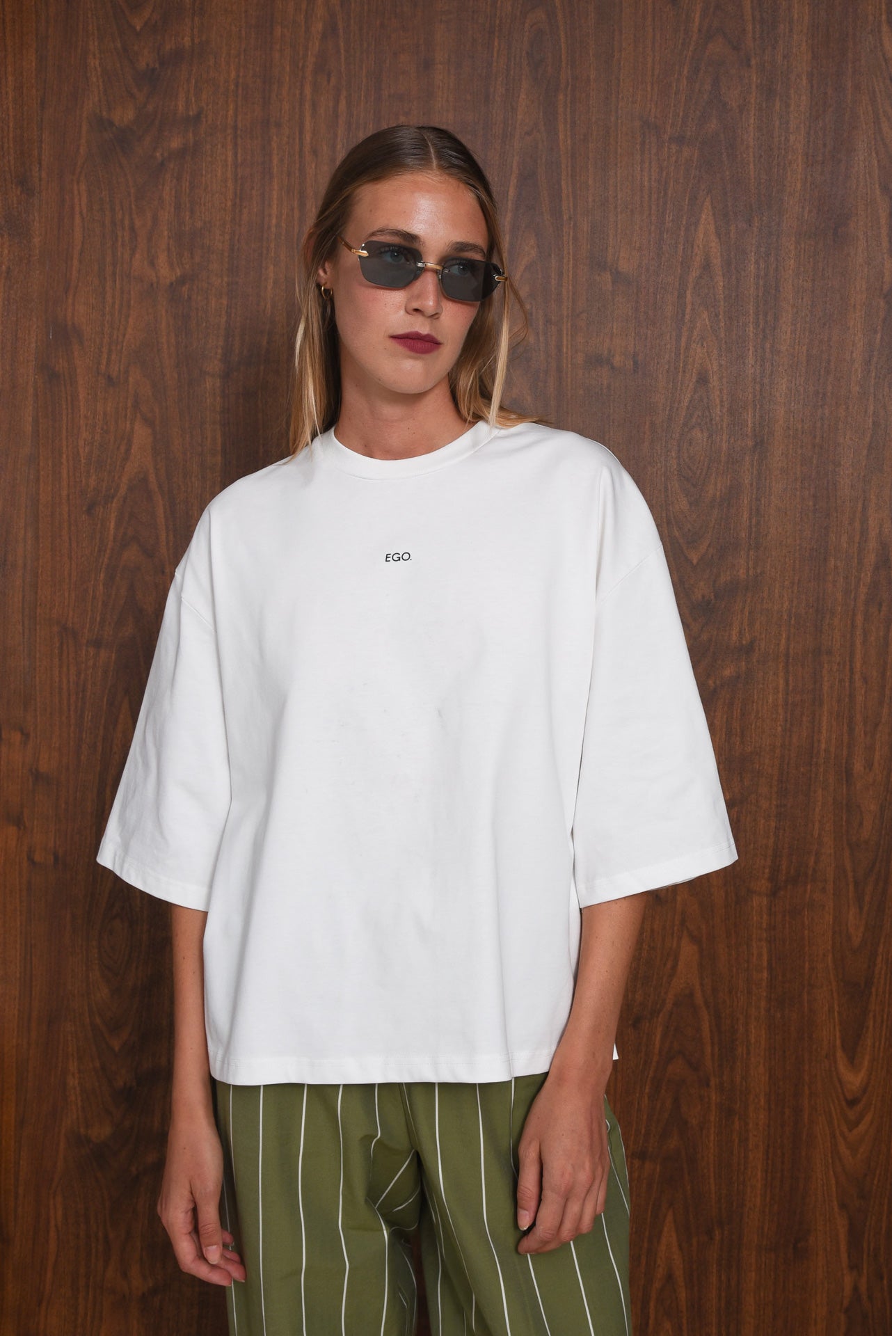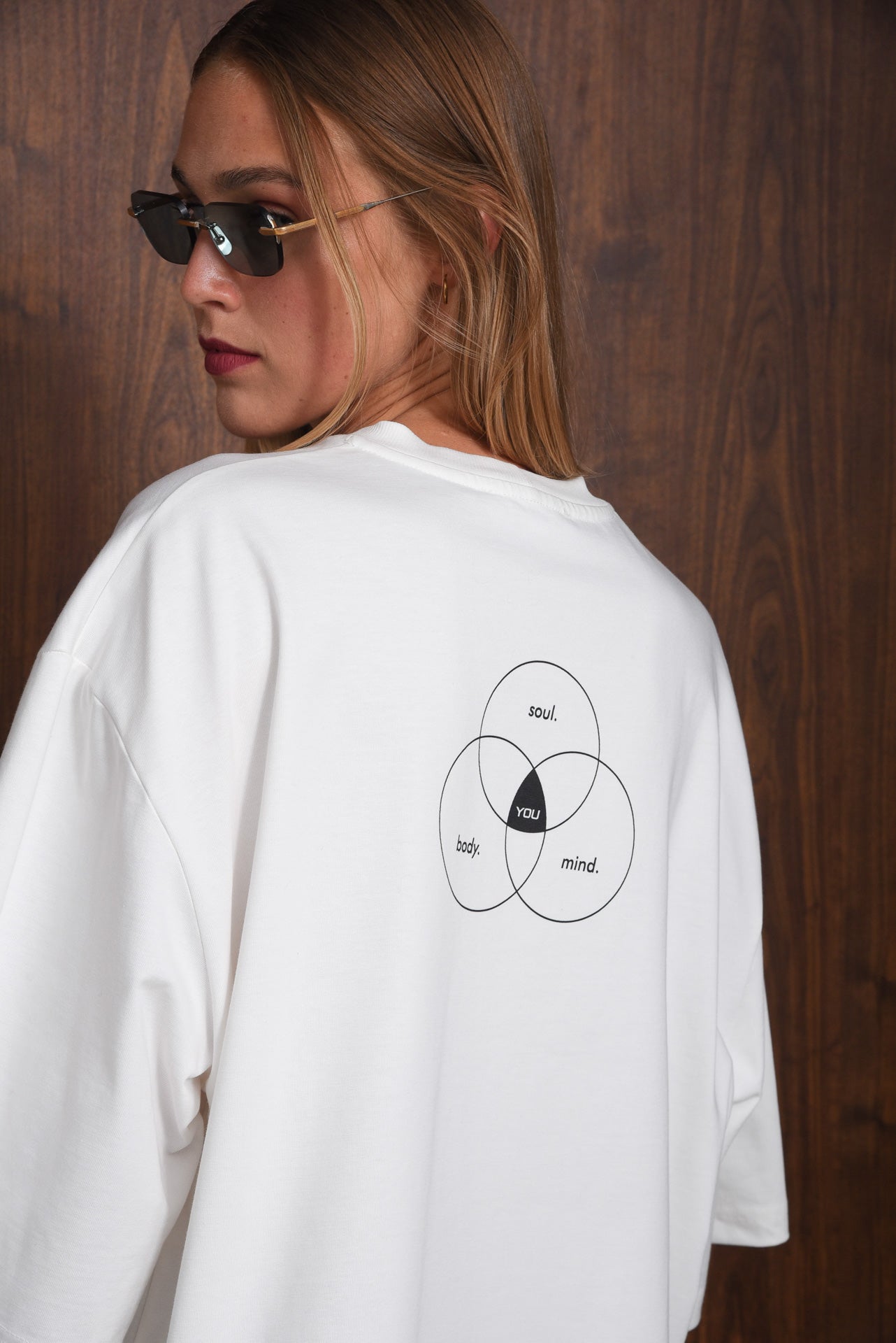 The Soul t-shirt is made from soft cotton with an oversized fit and dropped shoulders. It features a round neckline, short wide sleeves, boxy shape and “EGO“, collections’ name printed on the chest. The back shows a graphic with “Soul, Body, Mind, You” in a circle design. Comfortable and versatile, it pairs easily with any look.