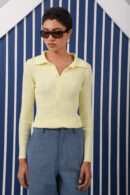 A fitted ribbed knit polo crafted from soft stretch fabric for a flattering, structured silhouette. Designed with a classic polo collar, button placket and long sleeves finished with ribbed cuffs and hem. Clean and versatile, it combines refined tailoring with everyday comfort for effortless styling.